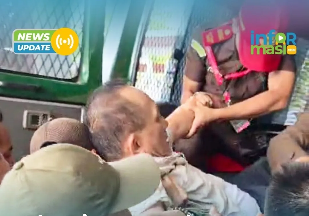 Petugas membopong Iwan agar masuk ke mobil tahanan.